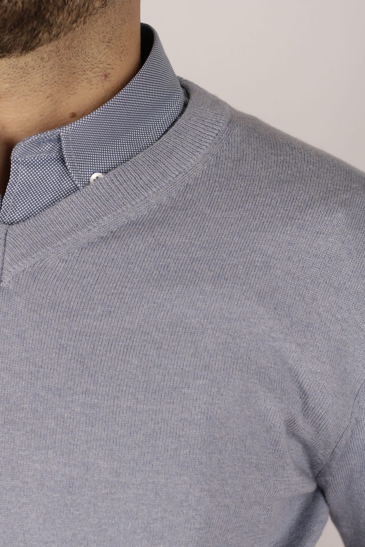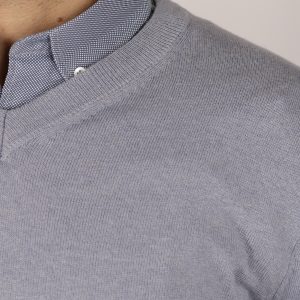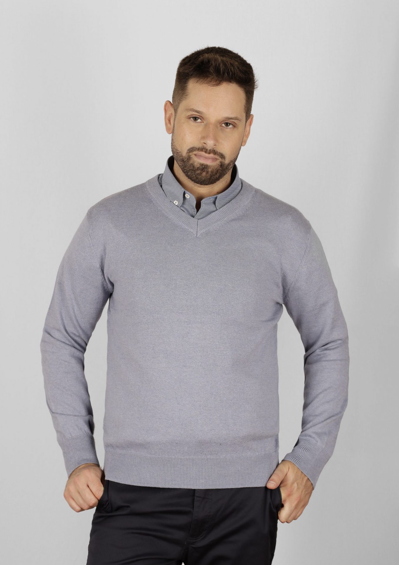 - Sweater básico manga larga, cuello V reforzado, regular fit.